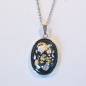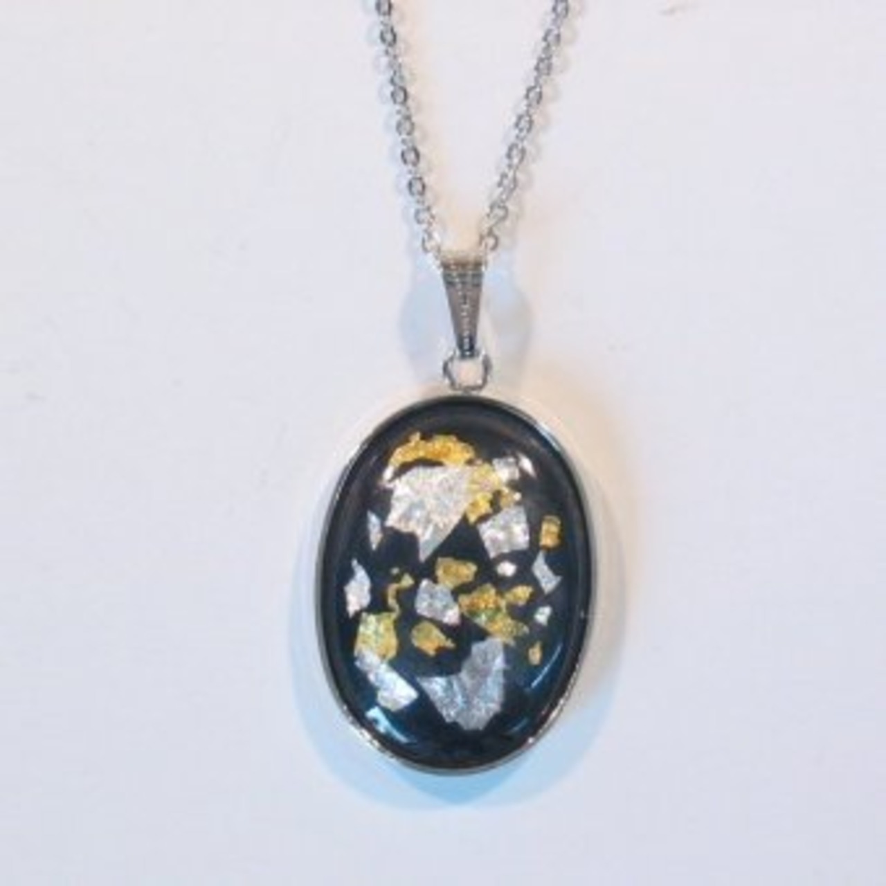 オーソドックスな小判型の銅板に金箔と銀箔を散りばめました。無地のセーターの上に合わせると良いですね。